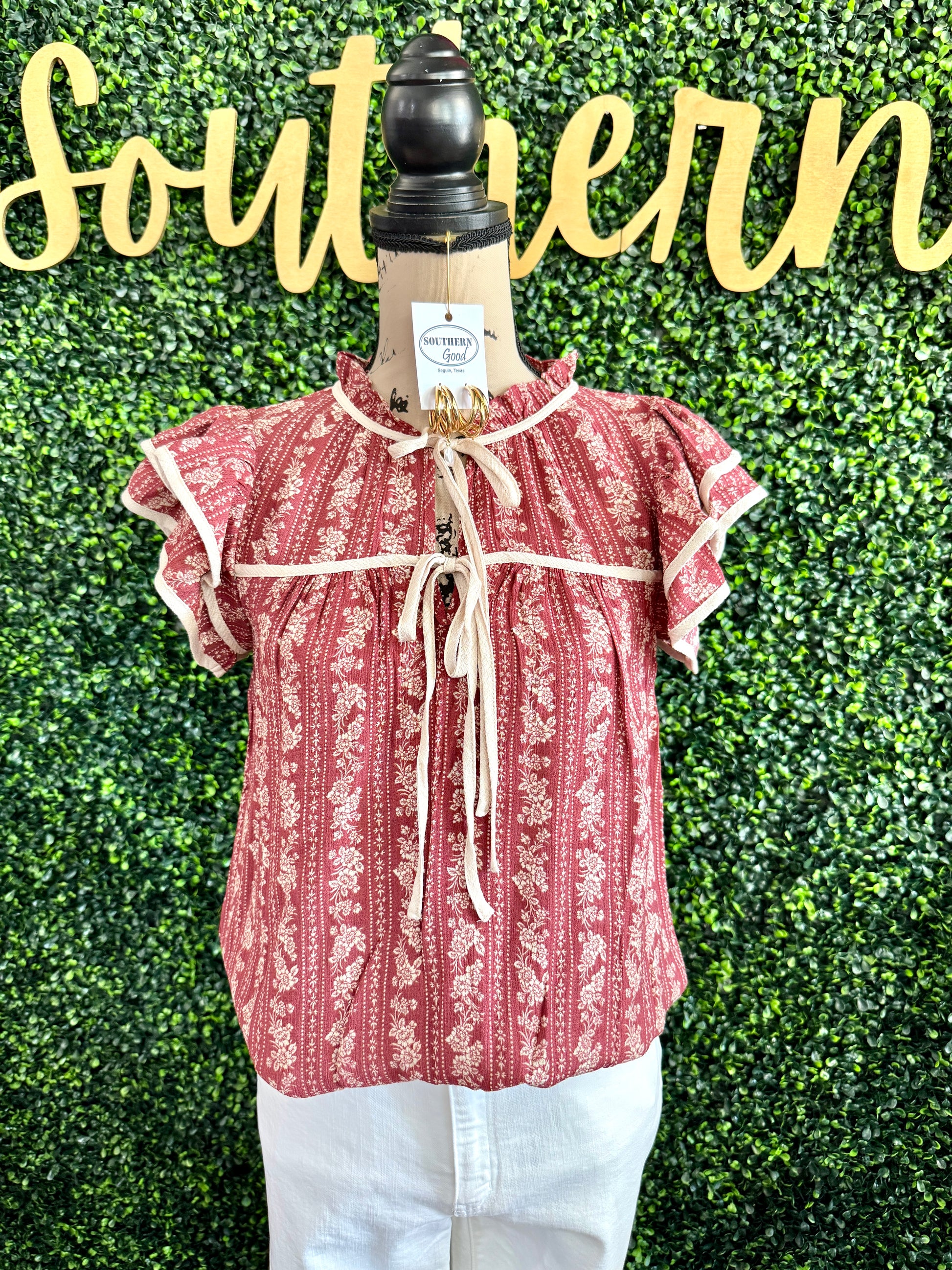 Elevate your style with the Addie Top by Blu Pepper, featuring delicate short ruffled layered sleeves and a flattering double front tie. The floral pattern adds a fresh, feminine flair, making it an ideal choice for effortless elegance on any occasion.