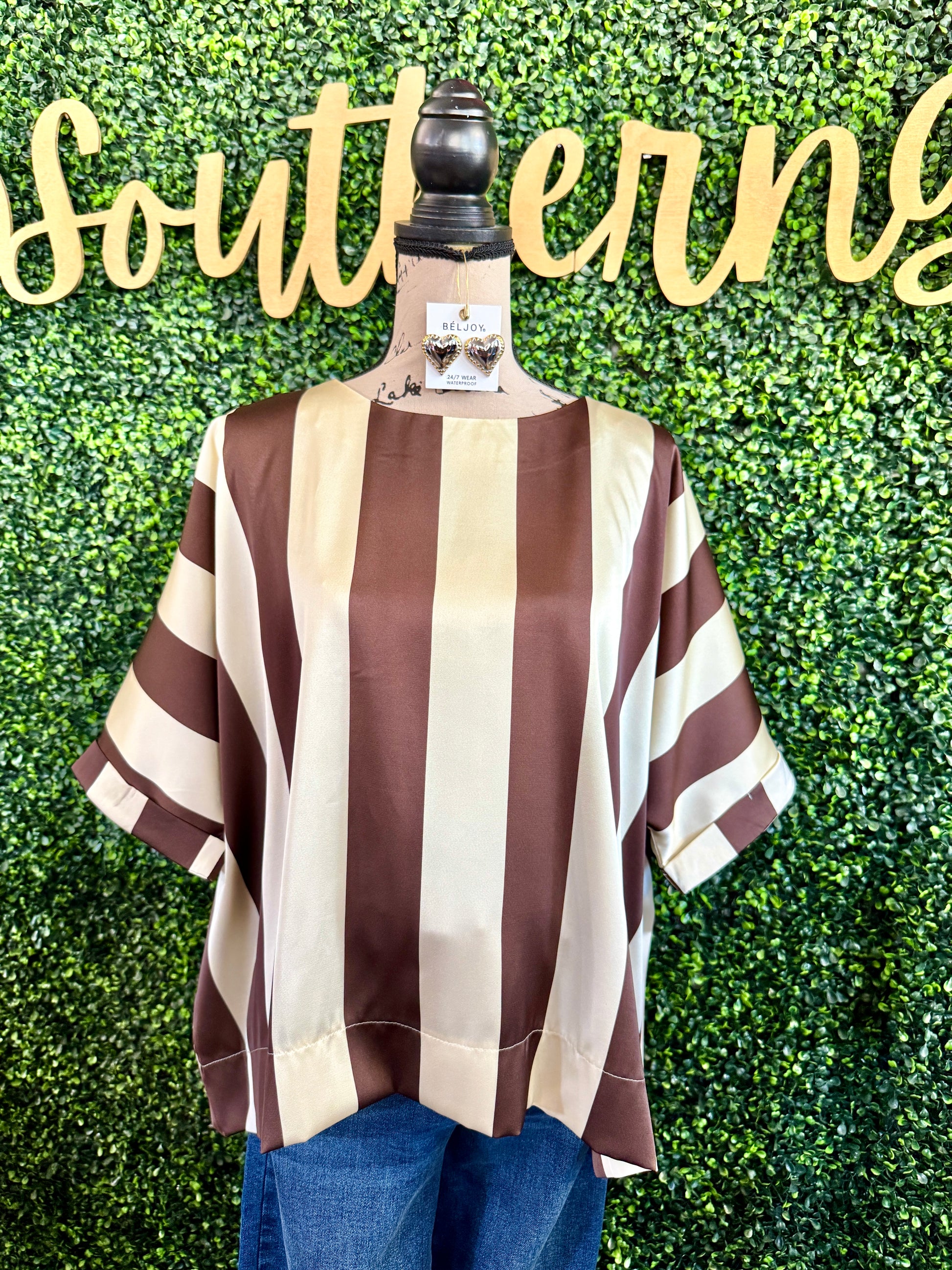 Experience effortless style with the Aidlynn Brown Top from Glam. Featuring an oversized fit and a round neckline, this striped top combines comfort with a relaxed, modern look. Perfect for everyday wear, it pairs easily with your favorite jeans or skirts, adding a touch of casual sophistication to any outfit. Embrace a laid-back yet polished vibe with this versatile staple.