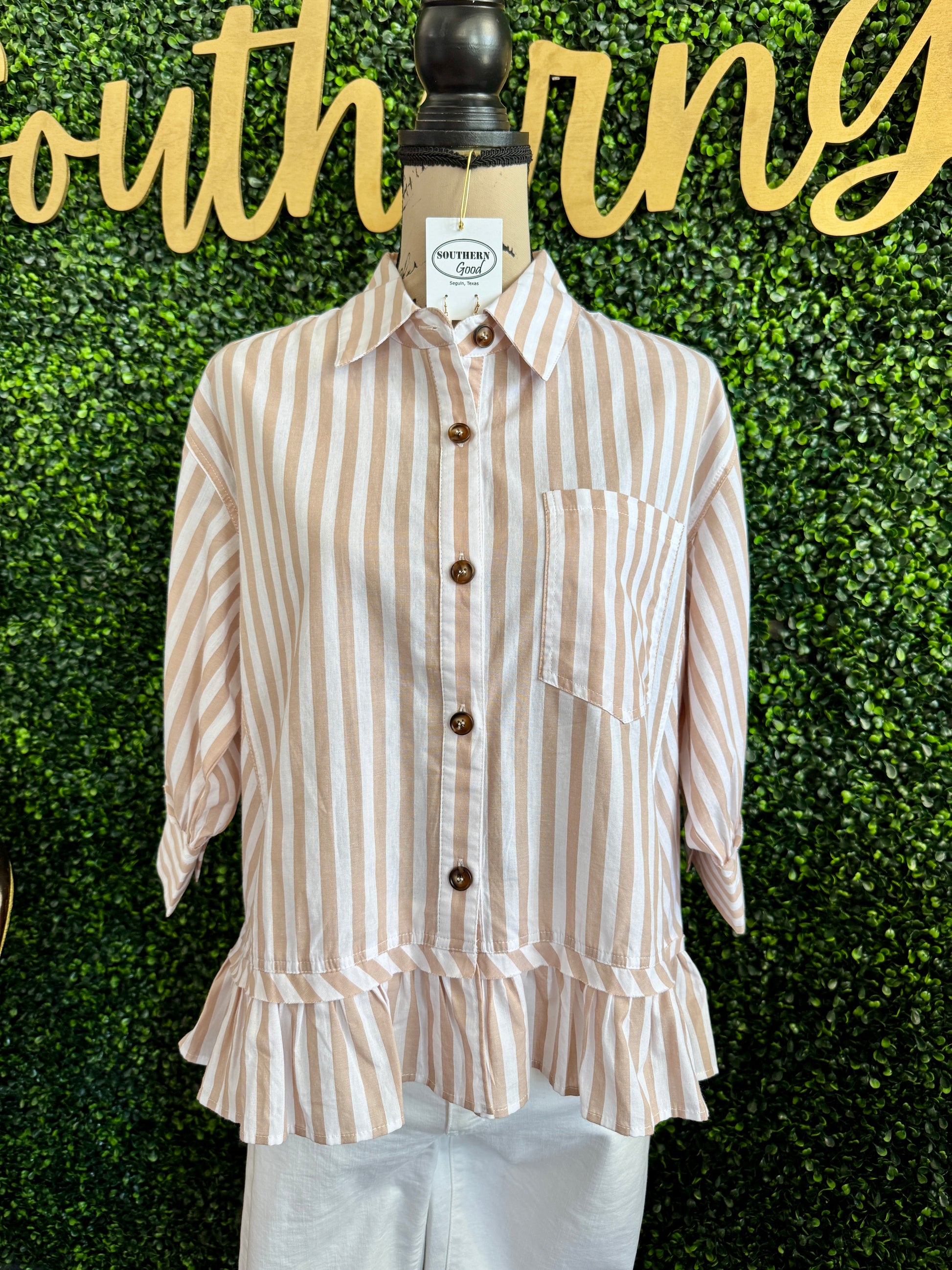 The Alma Top by Sewn & Seen is a stylish striped button-down featuring elegant ruffle details that add a touch of femininity to your look. Crafted for comfort and versatility, this top effortlessly transitions from day to night, making it a must-have addition to your wardrobe. Embrace timeless style with a modern twist and elevate your everyday outfits with the Alma Top.