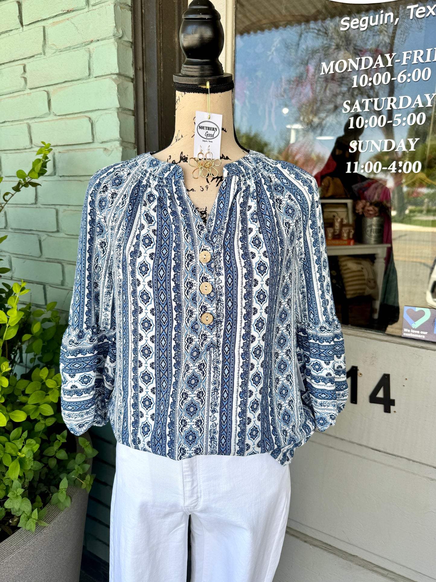 Elevate your fashion game with the Angela Top! This stylish piece features a captivating ethnic print, adding an eye-catching touch to any outfit. Plus, it comes in a range of sizes to fit and flatter all body types. Upgrade your wardrobe today and make a statement!