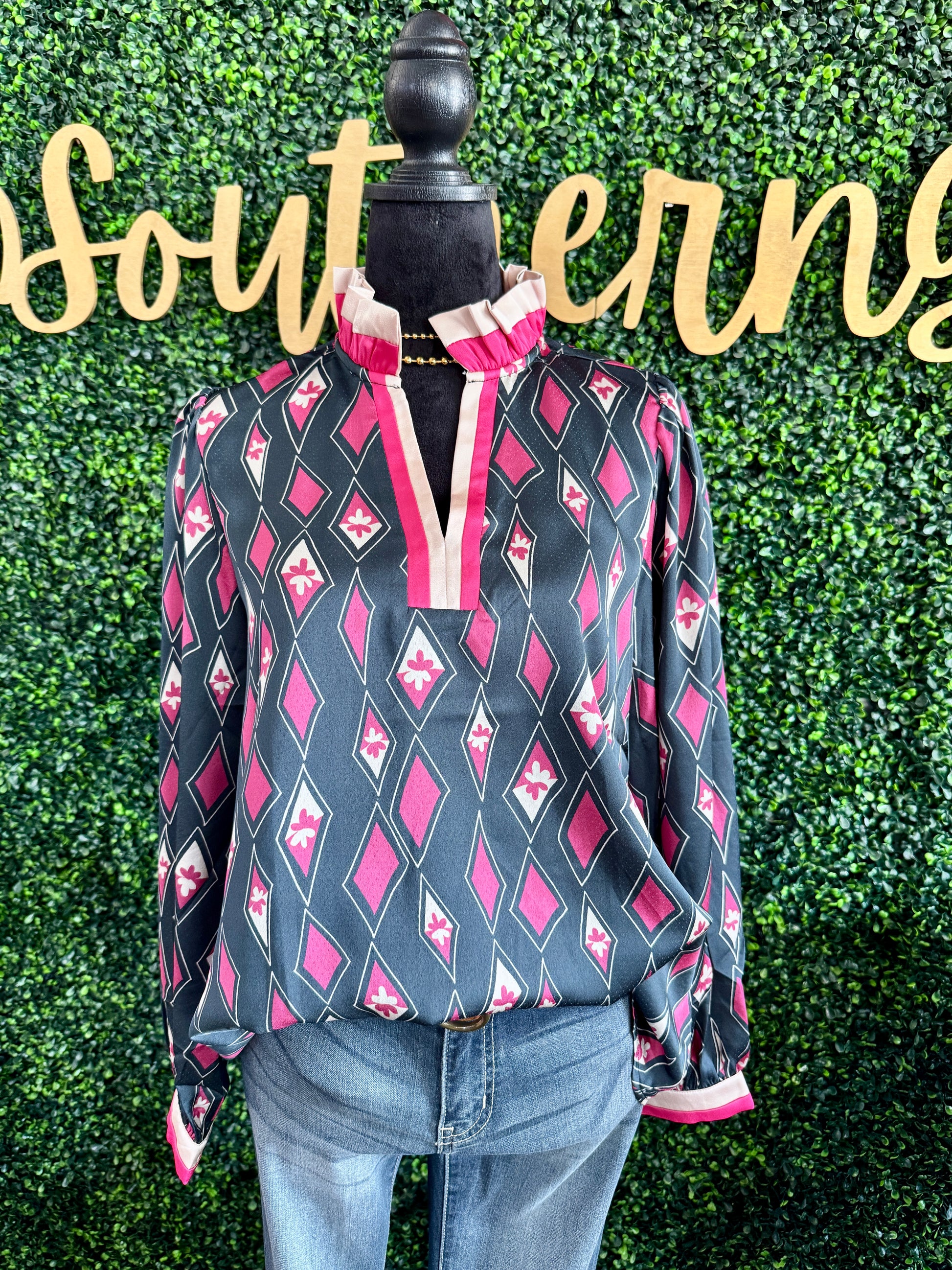 Elevate your wardrobe with the Ayden Top by Jodifl, featuring a unique diamond and floral print that blends timeless charm with modern style. Its long sleeves provide comfortable coverage while the delicate ruffled mock neckline adds a touch of femininity and sophistication. Perfect for dressing up or down, this top offers versatile elegance to enhance any outfit.