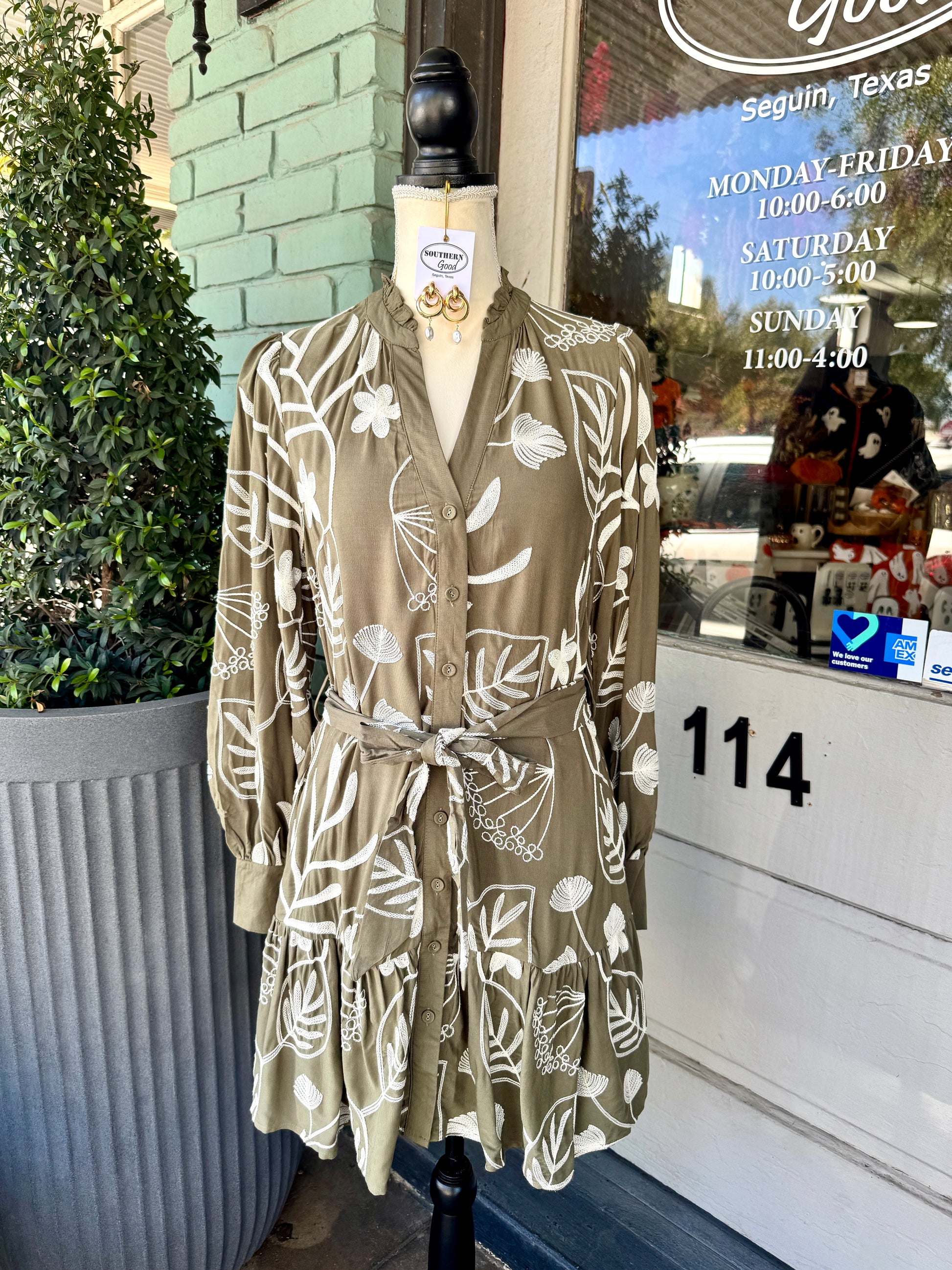 The Ayra Dress combines elegance and charm with its long sleeves and ruffle collar that frame a graceful button-down front. A belted waist enhances your silhouette, while delicate leaf embroidery adds a unique, artistic touch. This versatile dress offers both comfort and sophistication, making it an ideal choice for day-to-night wear.
