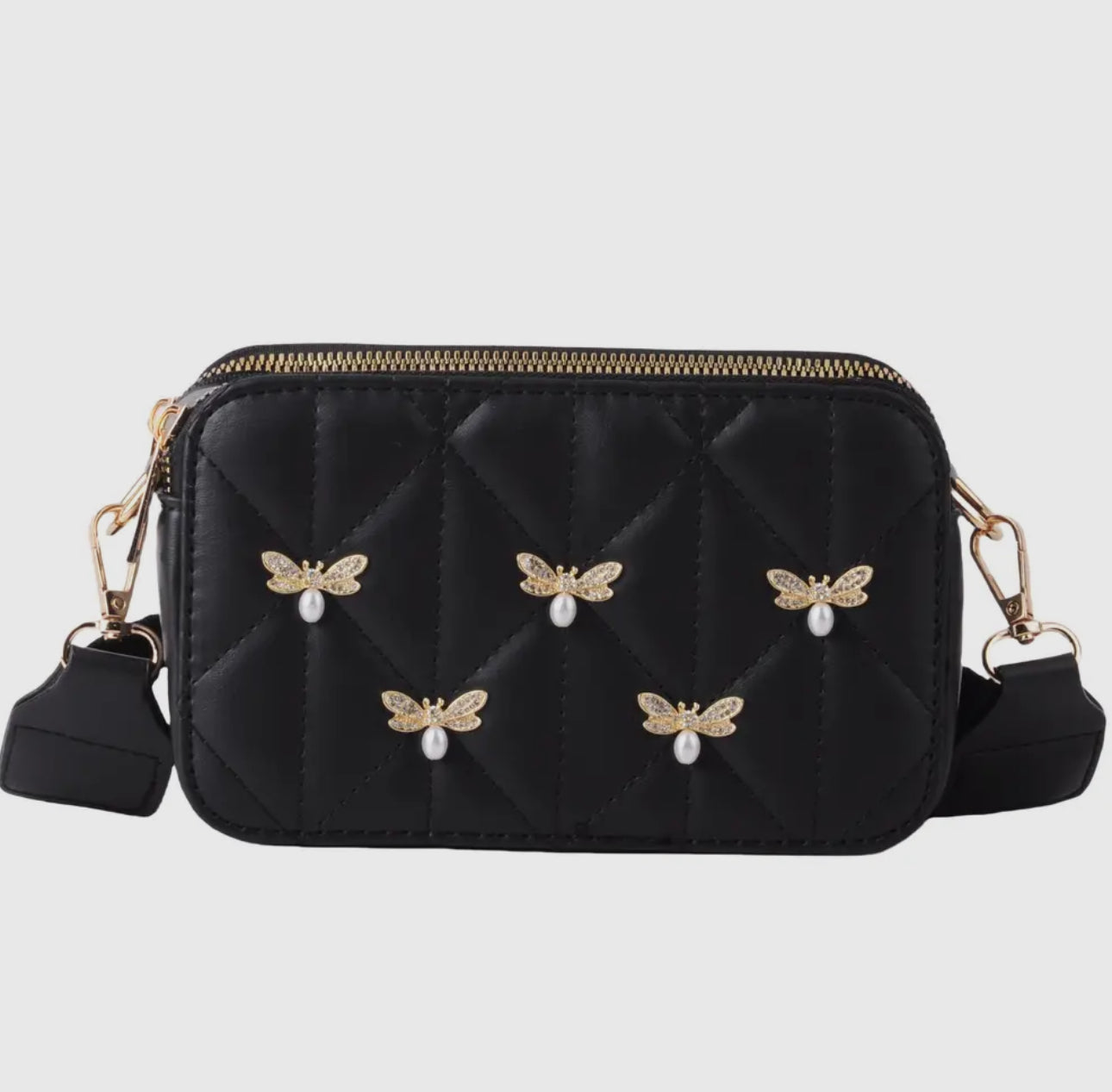 The Bumble Bee Black Camera Bag combines functionality with fun, featuring playful bumble bee charms that brighten your look. Its stylish web strap ensures comfortable carrying while adding a modern edge. Perfect for photographers who want to protect their equipment without sacrificing style.