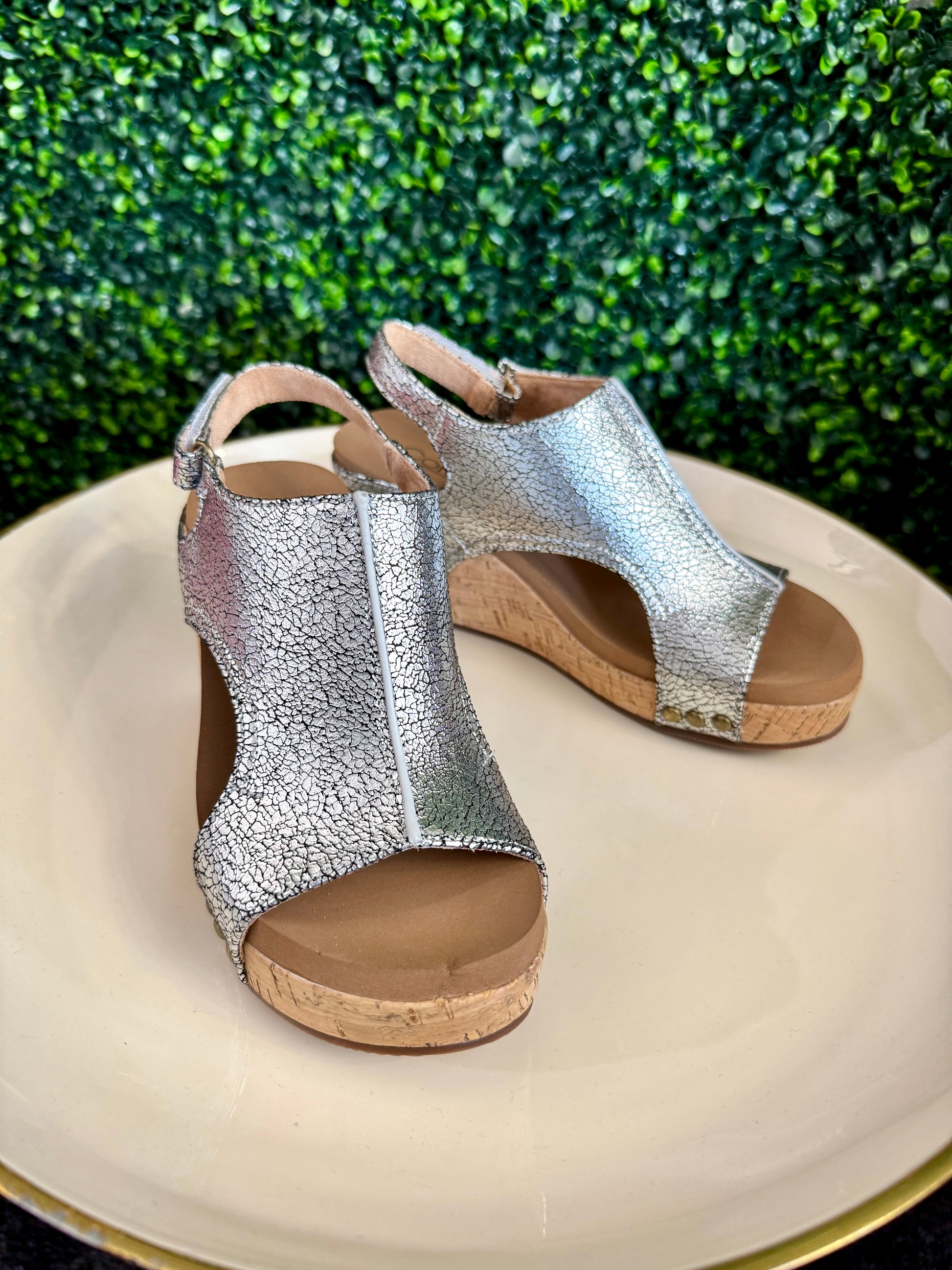 Experience exceptional comfort and style with the Carley Silver Wedge from Corkys. Featuring a lightweight cork wedge and soft vegan leather, these sandals offer a breathable, cruelty-free option for all-day wear. The adjustable velcro back strap ensures a secure, customized fit, making every step feel effortless. Perfect for casual outings or dressing up, these wedges combine trend-right design with unmatched comfort.