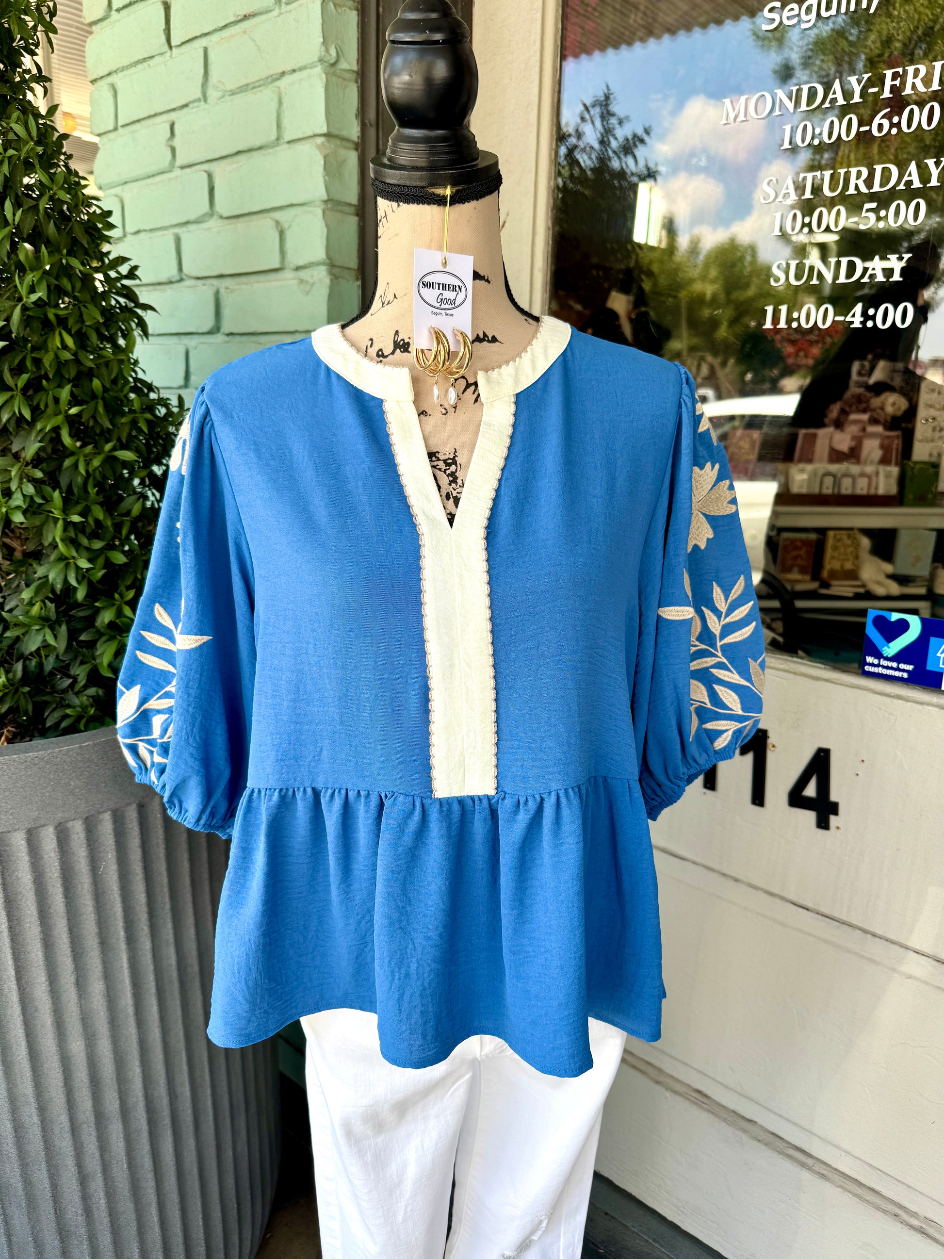 Elevate your style with the Channing Top by Oddi, featuring delicate embroidery and a flattering peplum silhouette. The airy design and 3/4-length puff sleeves offer comfortable movement and breathability, making it perfect for day-to-night wear. This top blends elegance with effortless charm to enhance any wardrobe.