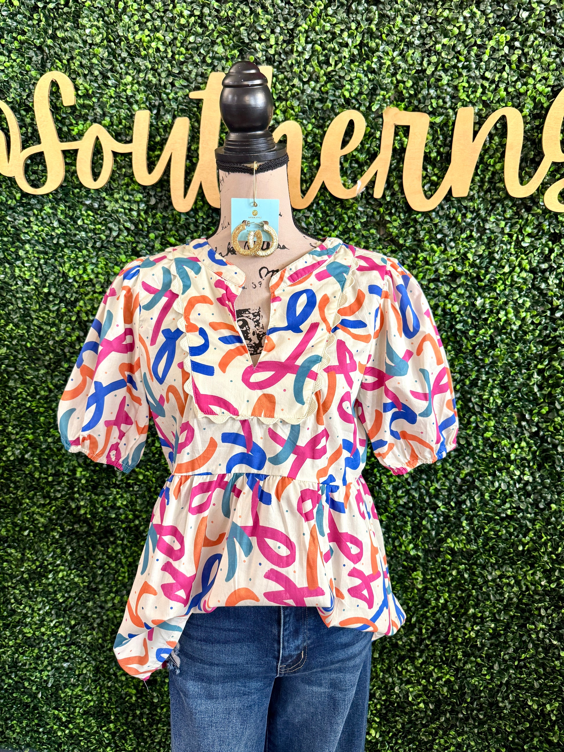 Introducing the Connie Top from Umgee—a fresh take on effortless style. This v-neck beauty features eye-catching bold print and romantic puff sleeves that add dimension and movement to your everyday look. The flattering neckline and voluminous sleeves create a modern silhouette that works beautifully for both casual outings and dressed-up occasions. Perfect for layering or wearing solo, the Connie Top brings personality and polish to any wardrobe. Elevate your style with this must-have piece that combines comfort with contemporary flair.