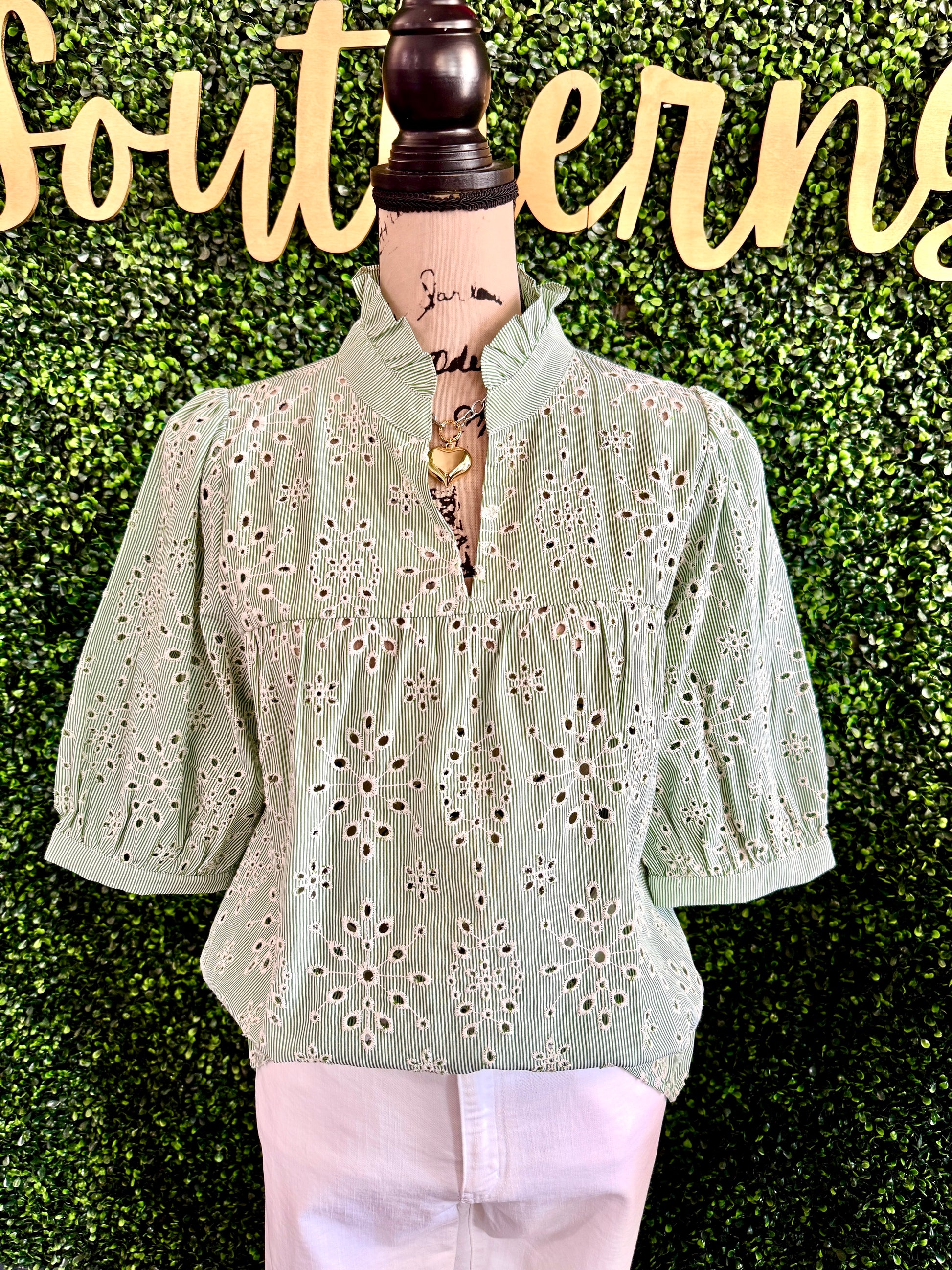 Elevate your wardrobe with the Coraline Top from Oddi. Featuring delicate embroidery and pin-striped eyelet fabric, this top combines elegance with subtle texture. The puff sleeves and V-neck with a high collar create a flattering silhouette that’s perfect for both casual outings and dressier occasions. Experience a unique blend of classic charm and modern style in one versatile piece.