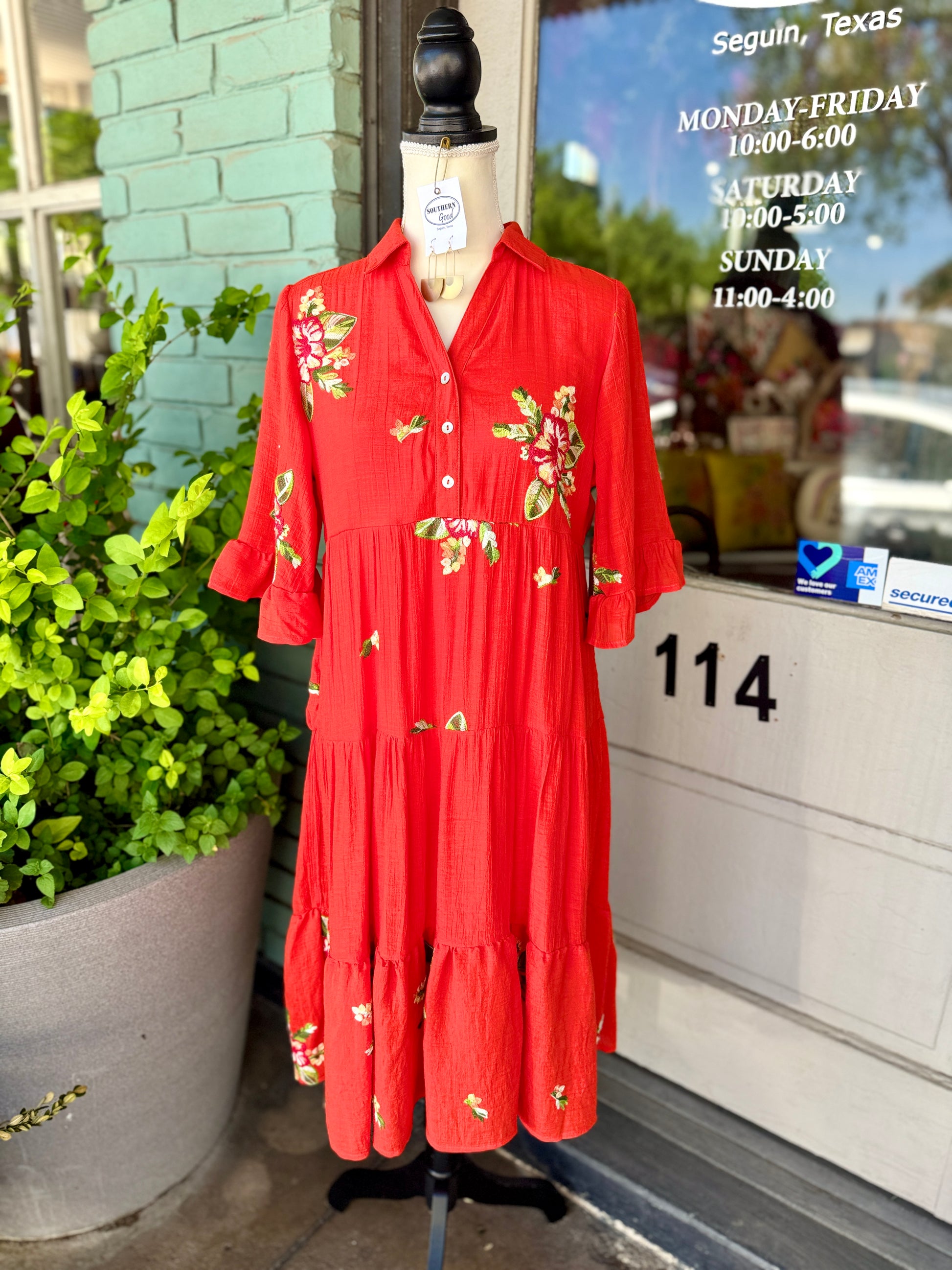 Experience effortless beauty in our Daphne Midi Red dress. Made with embroidered gauze and ruffle sleeves, the lined peasant dress exudes charm and style. Elevate your wardrobe with this elegant and versatile piece.
