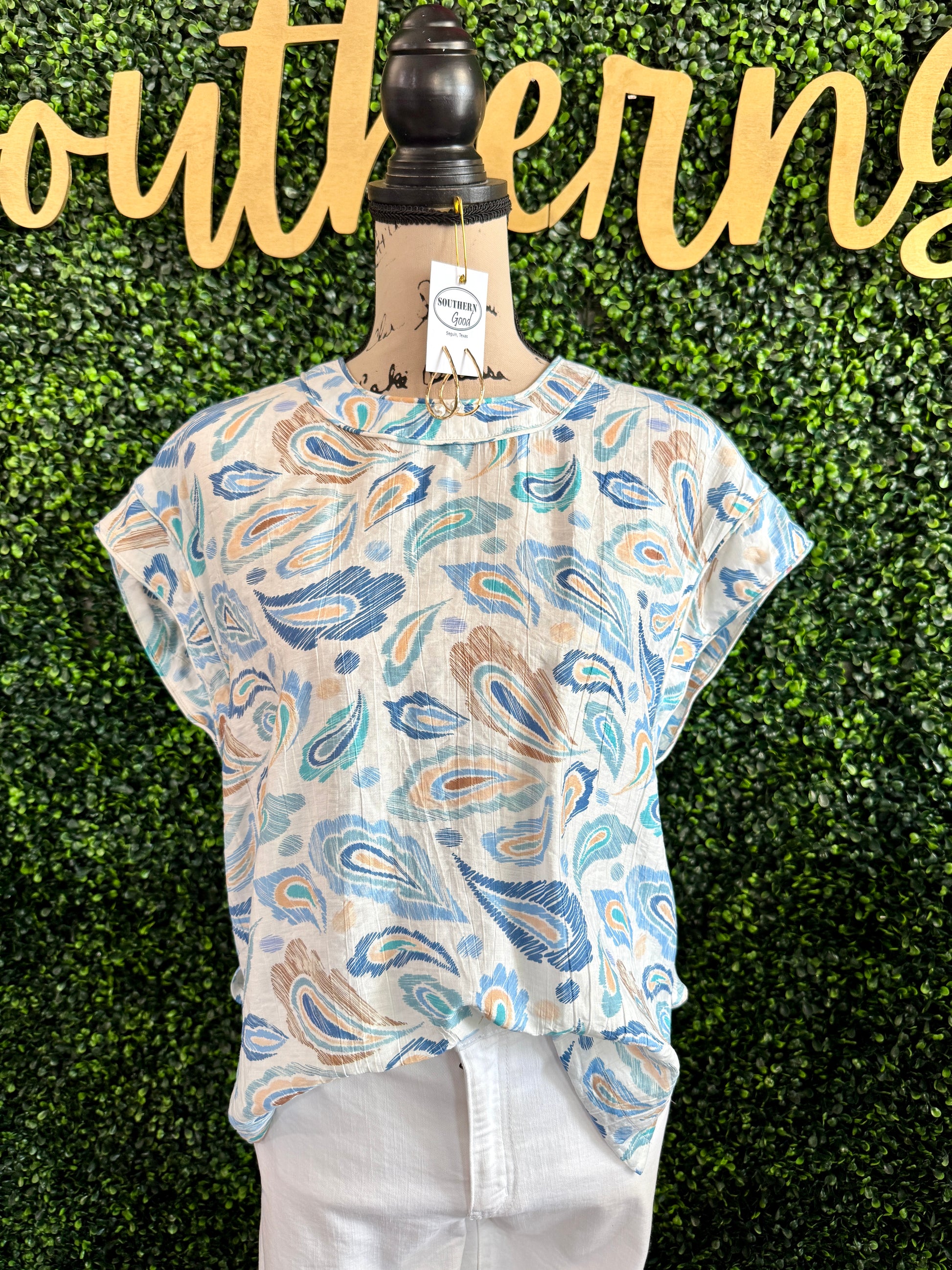 The DeeAnn Blue Top from Gigio combines classic paisley print with a modern round neck and cap sleeves for a stylish, comfortable fit. Its subtle back button detail adds a unique touch, making it an ideal choice to effortlessly elevate your everyday wardrobe. Perfect for any occasion, this top blends timeless design with contemporary flair.