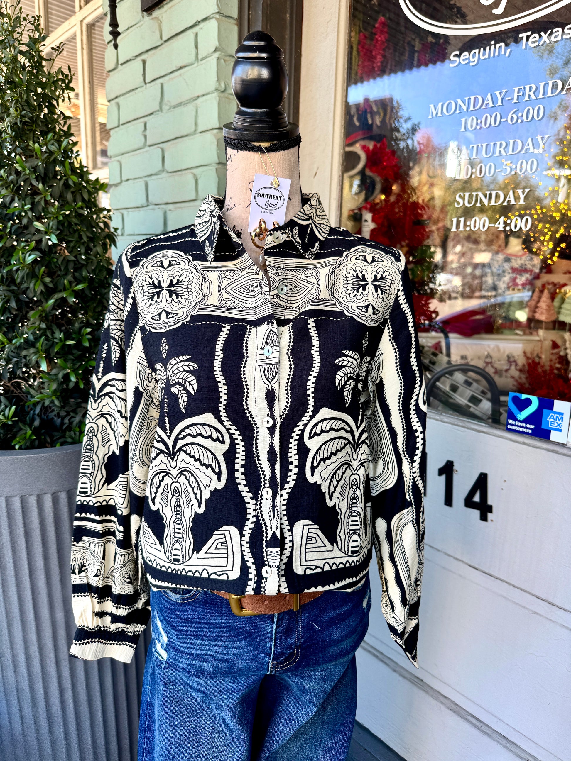 Elevate your everyday style with this stunning scarf print long sleeve button-up from Gigio. The Denise features a sophisticated black base adorned with eye-catching scarf-inspired patterns that instantly add visual interest to any outfit. Perfect for layering or wearing solo, this versatile piece transitions seamlessly from casual weekends to polished weekday looks. The classic button-up silhouette offers timeless appeal while the long sleeves provide comfortable coverage. Whether you're dressing up for brunch or keeping it relaxed, this new arrival delivers effortless elegance with a distinctive touch that sets you apart.