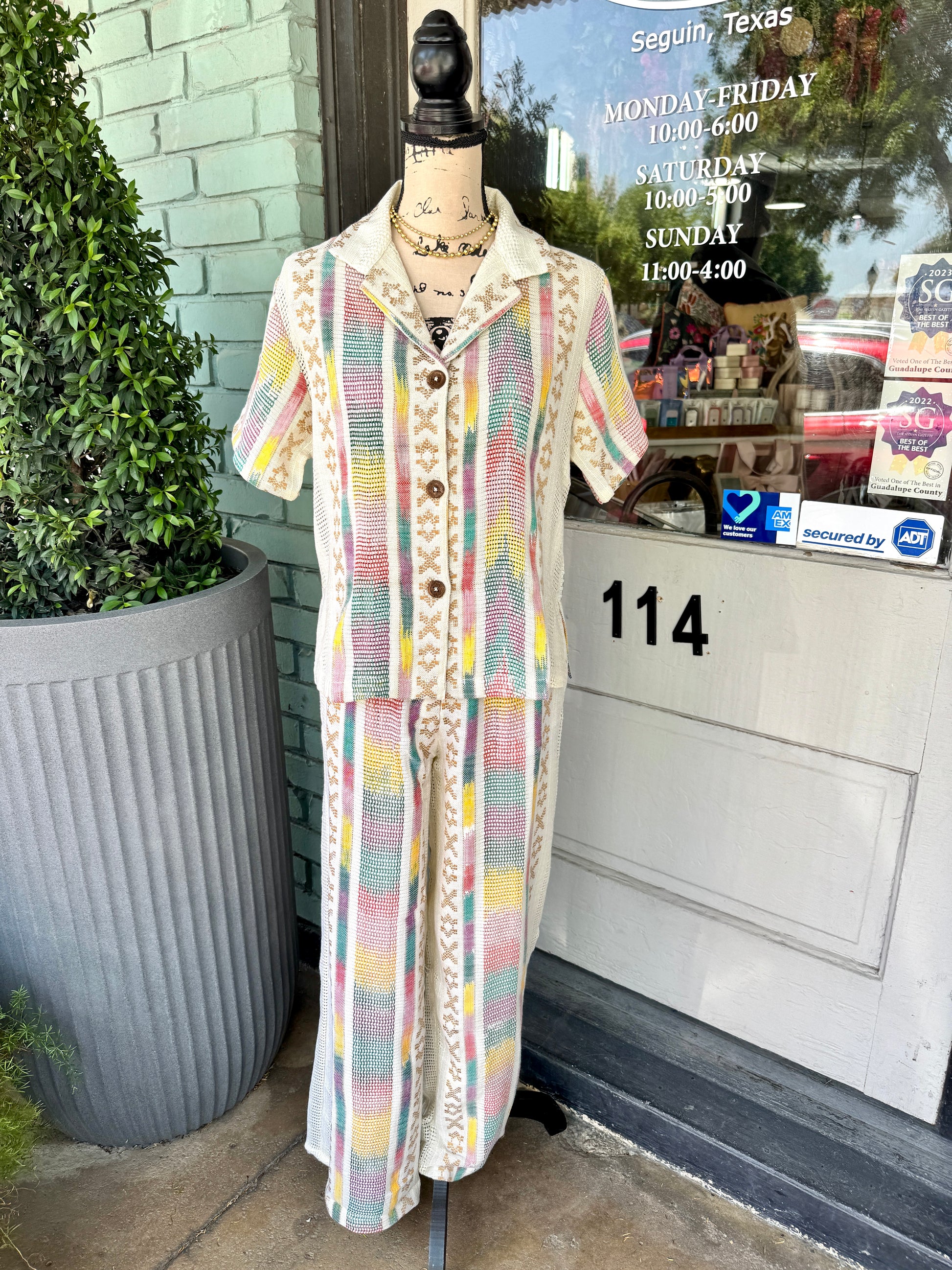 Elevate your wardrobe with the Donica Top from En Creme. This short sleeve button-down features delicate embroidery that adds a touch of elegance to your everyday look. Perfect on its own or paired with matching pants for a coordinated outfit that’s effortlessly chic. Comfortable and stylish, the Donica Top is designed to keep you looking polished all day long.