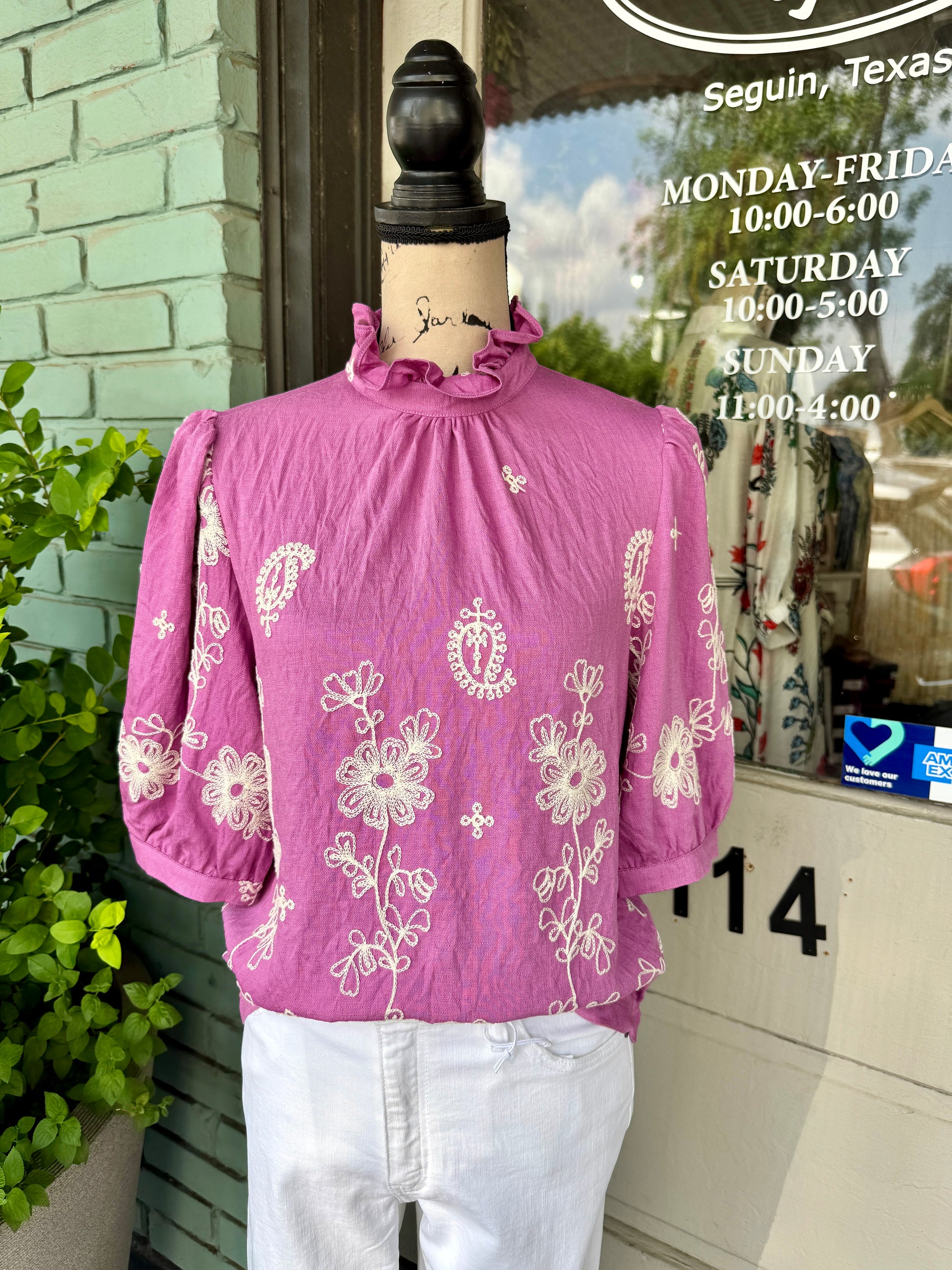Elevate your style with the stunning Dorian Top by Glam. Featuring a chic high collar and charming puff sleeves, this top exudes elegance and sophistication. The delicate embroidered details add a touch of femininity, making it the perfect statement piece for any wardrobe. Step out in confidence and turn heads in the Dorian Top.
