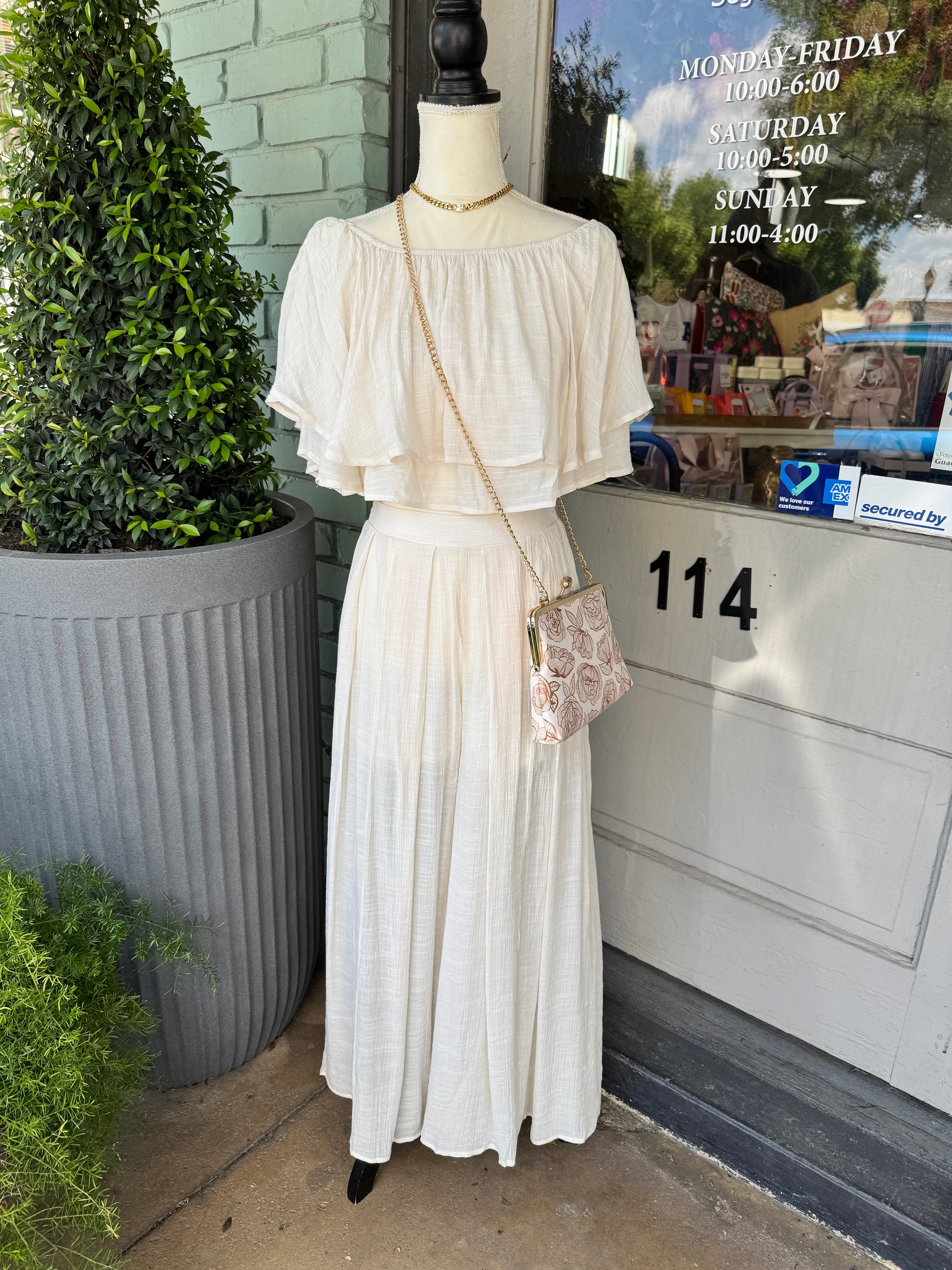 Elevate your style with the Elle Pant Set from HYFVE. Featuring an elastic off-the-shoulder top with 3/4 sleeves and a chic double-layered silhouette, this set combines comfort and elegance effortlessly. The high-waisted, flowy lined pants offer a flattering fit and graceful movement, perfect for any occasion. Embrace a look that’s both sophisticated and easy to wear.