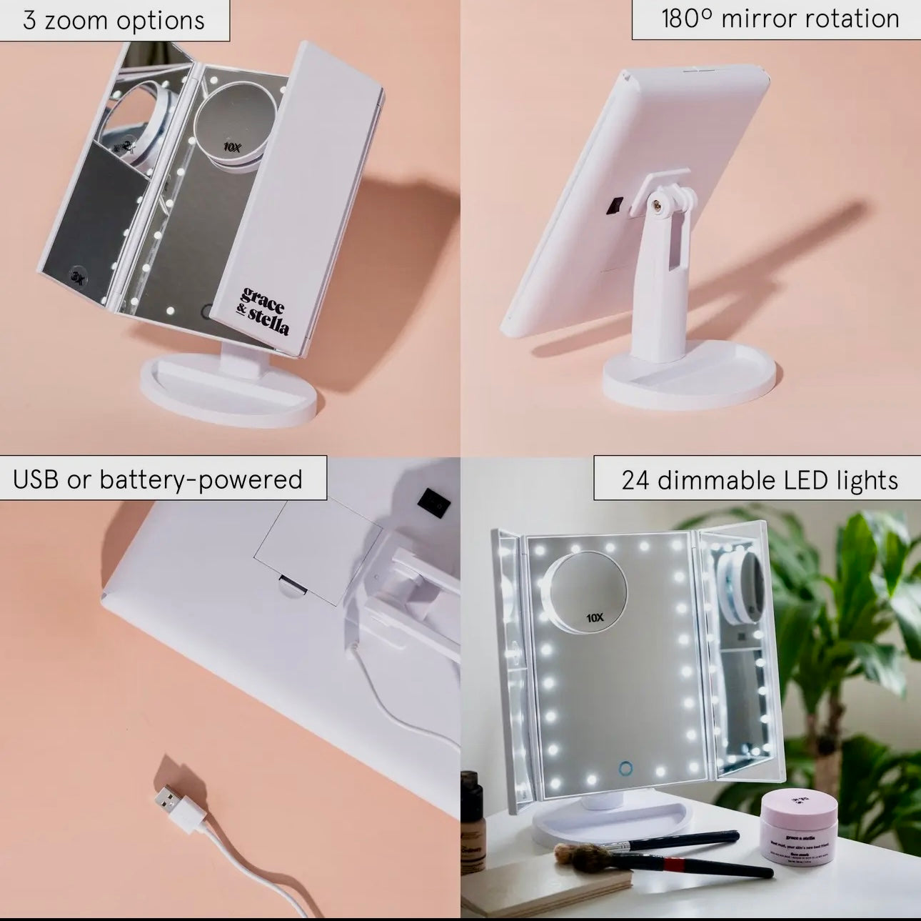 Elevate your beauty routine with the Grace & Stella Vanity Mirror, featuring bright LED lights that provide flawless illumination. Designed to enhance your makeup application, this mirror ensures every detail is perfectly visible, helping you achieve a polished, professional look every time. Its sleek design fits seamlessly into any space, making it an essential tool for your daily grooming.