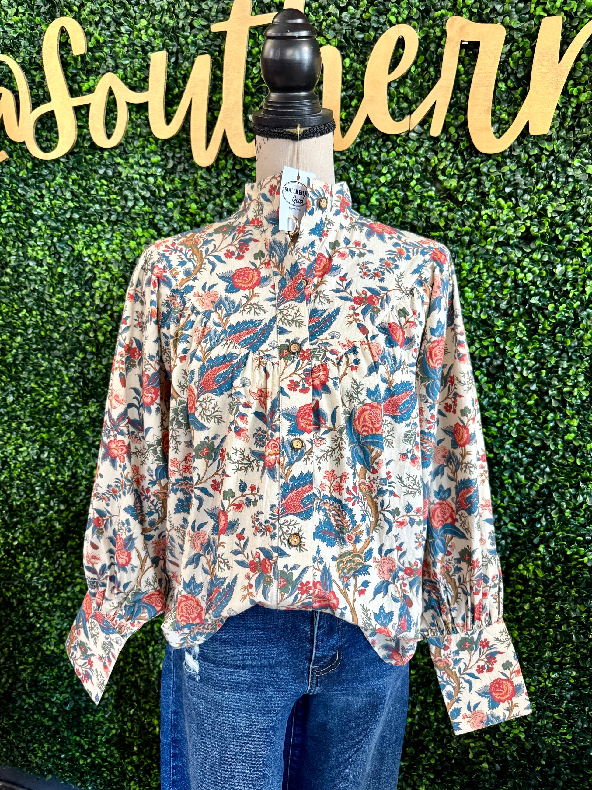 Embrace fall with the Jenna Top from Layerz, crafted from 100% cotton for all-day comfort and breathability. Its long sleeves and button-up design add timeless style, while the vibrant floral print brings a fresh, seasonal touch to your wardrobe. Ideal for layering or wearing on its own, this top blends classic charm with cozy warmth perfect for cooler days.