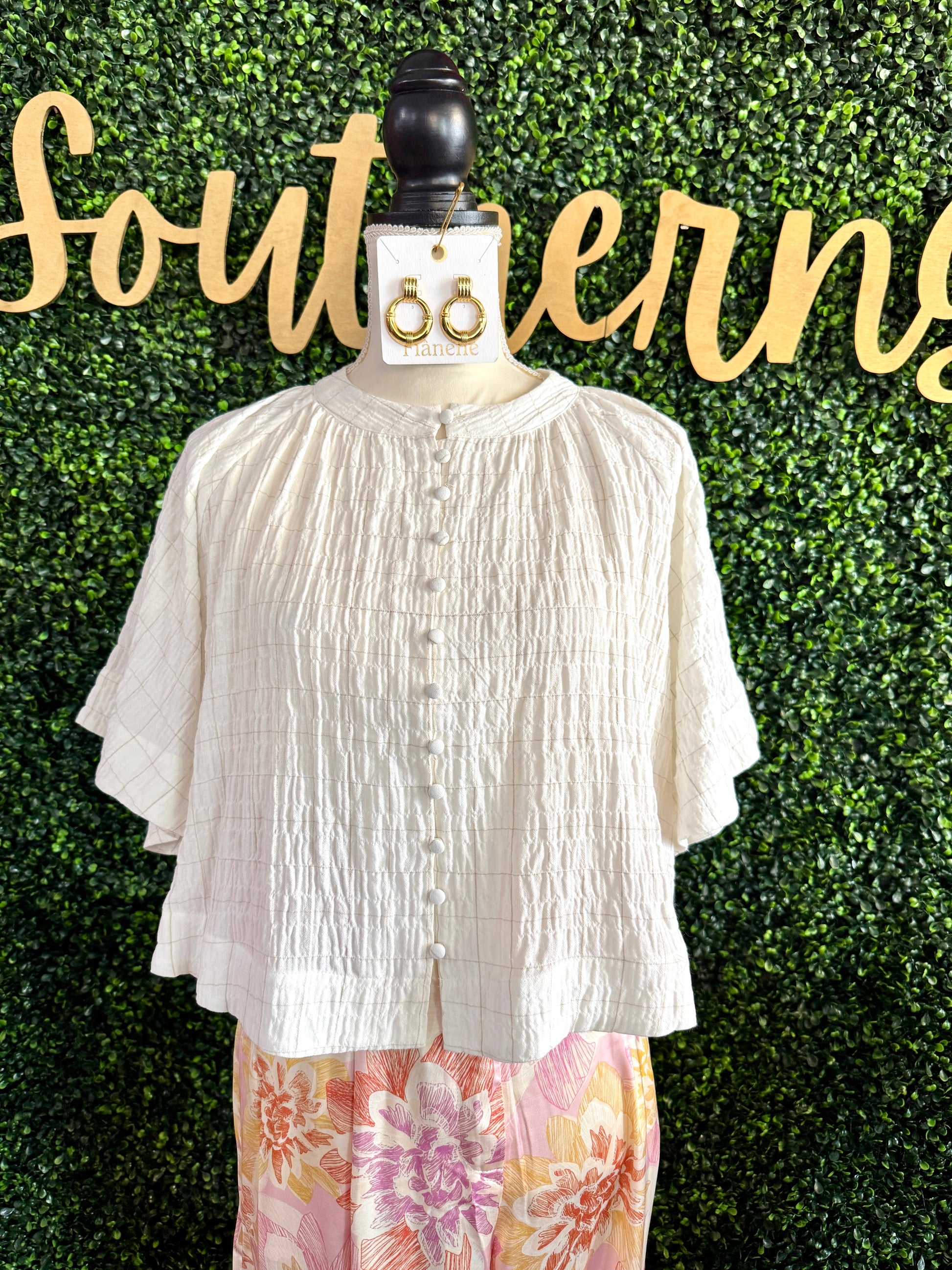 Introducing the Karson Top, crafted with 100% cotton and featuring a high-low button up design from FRNCH. This new arrival is the perfect addition to your wardrobe, combining comfort and style for a unique and versatile look. Elevate your outfit with the Karson Top today!