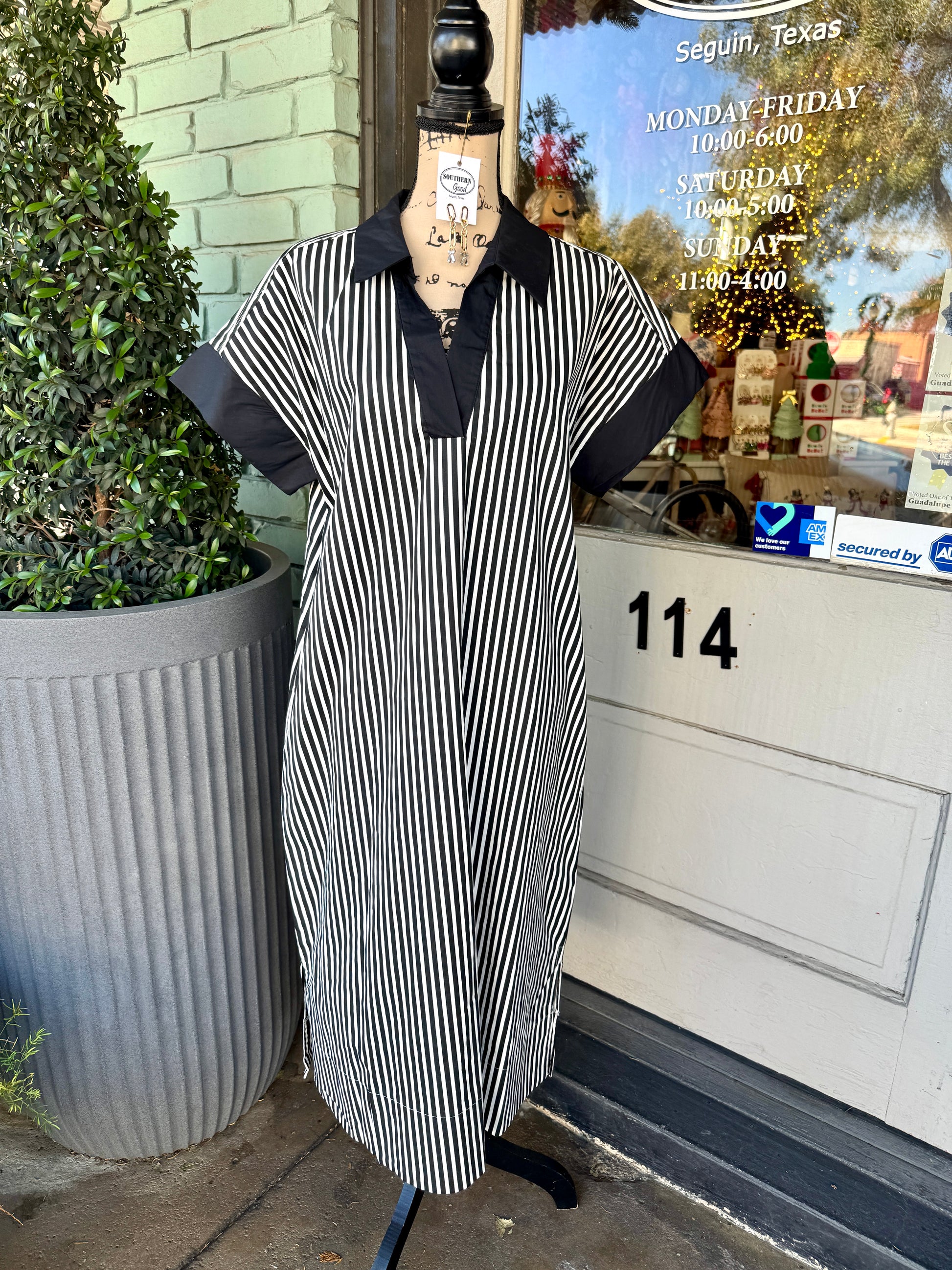 Elevate your everyday style with the Mona Black Midi, a fresh arrival from Glam that combines timeless elegance with modern practicality. This striking black and white striped midi dress features a sophisticated collar neck that adds polish to any occasion, while functional pockets keep your essentials within reach. The classic stripe pattern offers versatile styling options—dress it up for evening events or down for casual outings. Perfect for those who refuse to compromise between fashion and function, this midi is destined to become a wardrobe staple you'll reach for again and again.