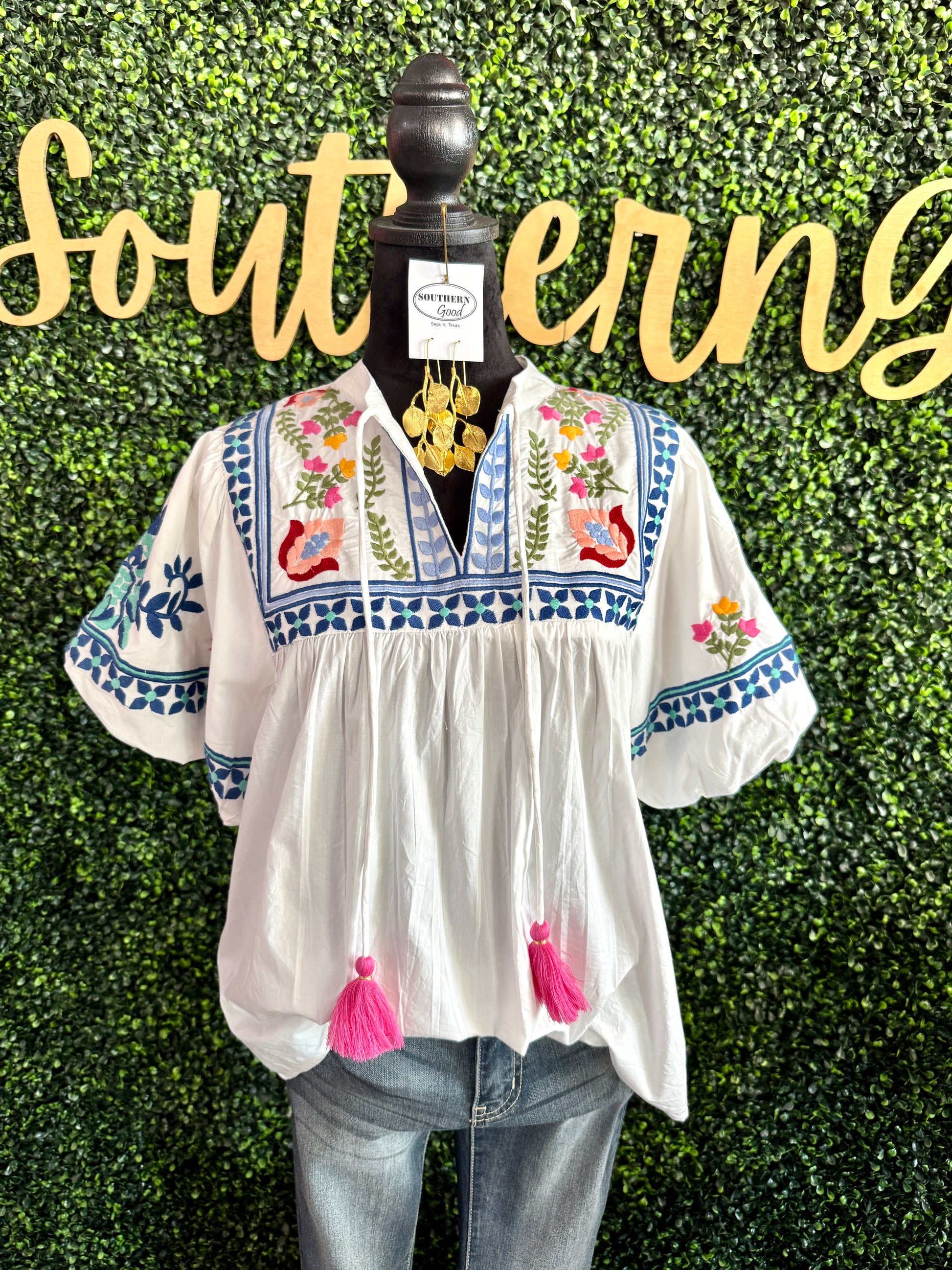 Elevate your wardrobe with the Nova Top, featuring delicate embroidered details and stylish puff sleeves that add a touch of elegance. The tassel tie neckline offers adjustable comfort and a charming finish, making it perfect for both casual outings and special occasions. Embrace effortless style and feminine flair with this versatile, eye-catching piece.
