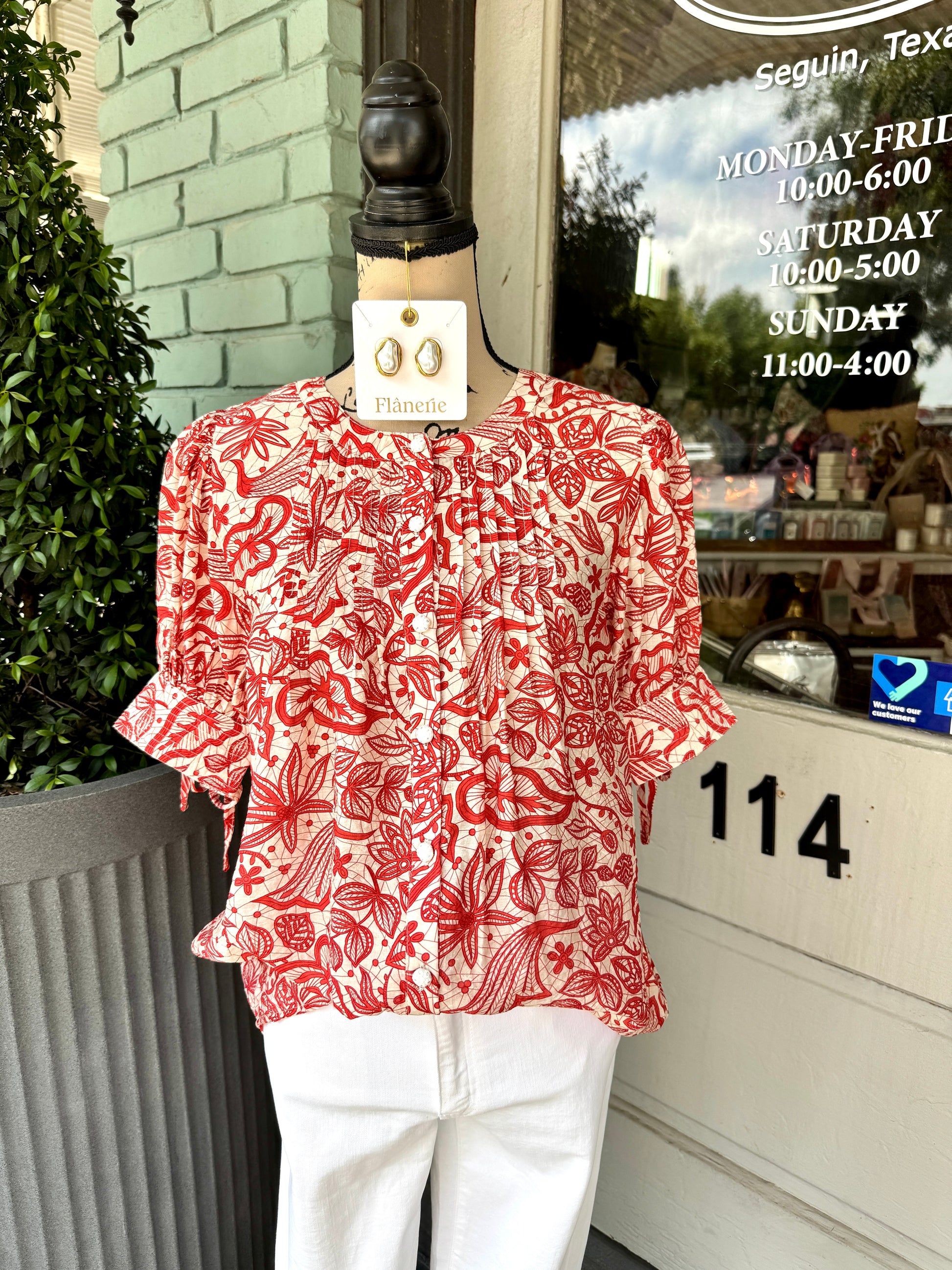 The Oliva Top by Gigio showcases a chic geometric floral print paired with elegant pleats for a refined look. Featuring delicate lace buttons, this top adds a touch of sophistication to any outfit. Perfect for elevating your everyday style with effortless grace.