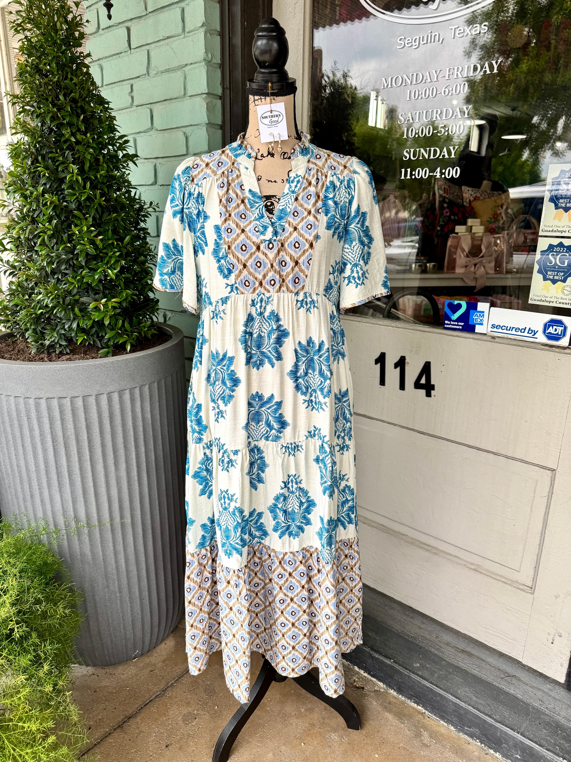Experience effortless elegance with the Reese Midi dress by Gigio. This mixed media print tiered midi dress features a flowy fit that moves gracefully with you, while convenient pockets add practical charm. Perfect for any occasion, its stylish design combines comfort and sophistication to elevate your wardrobe.