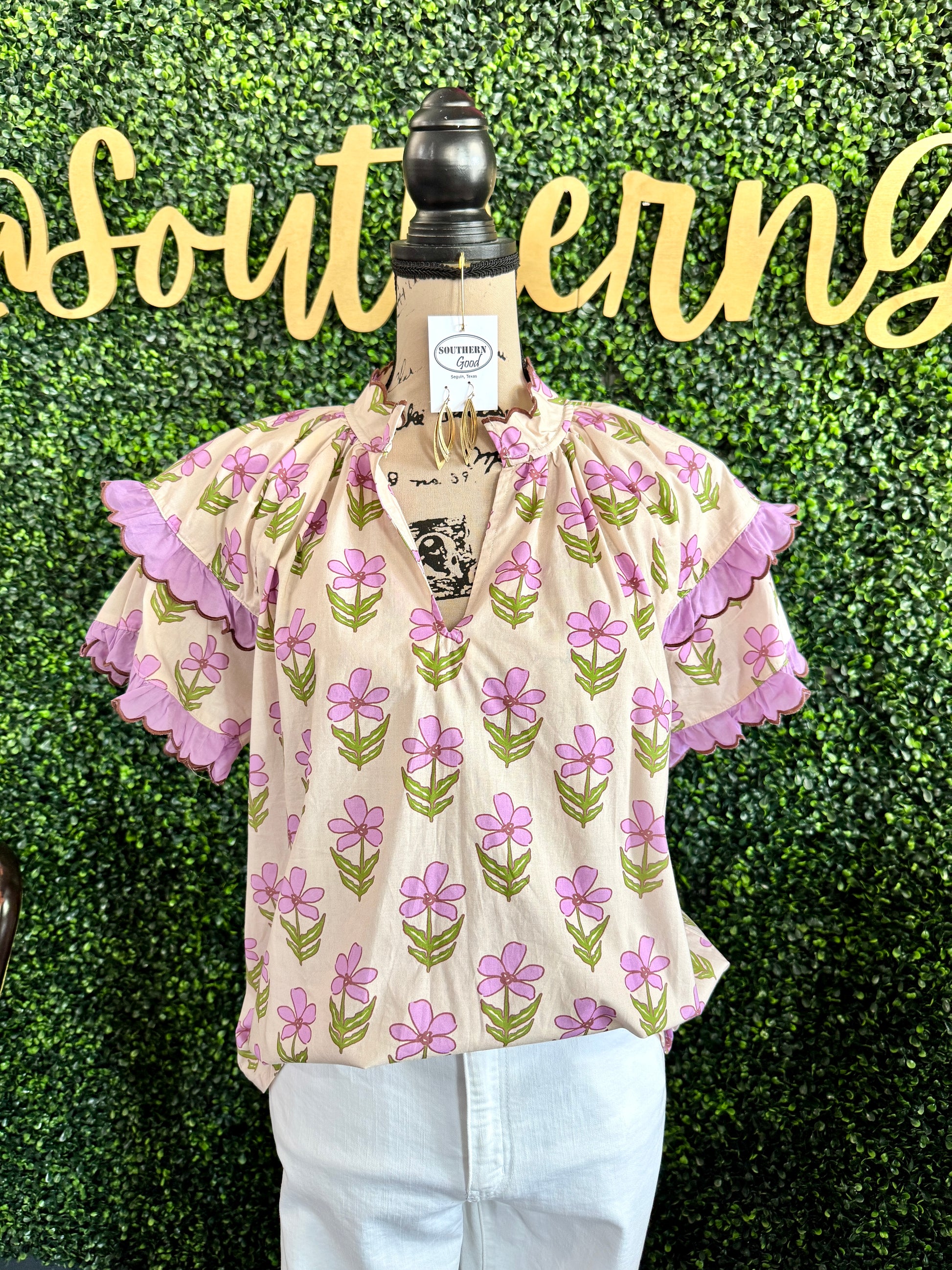 The Roney Top from Umgee features playful ruffle sleeves and a flattering V-neck, adorned with a vibrant floral print. This stylish design adds a touch of feminine charm to your wardrobe, perfect for elevating everyday looks with effortless elegance.