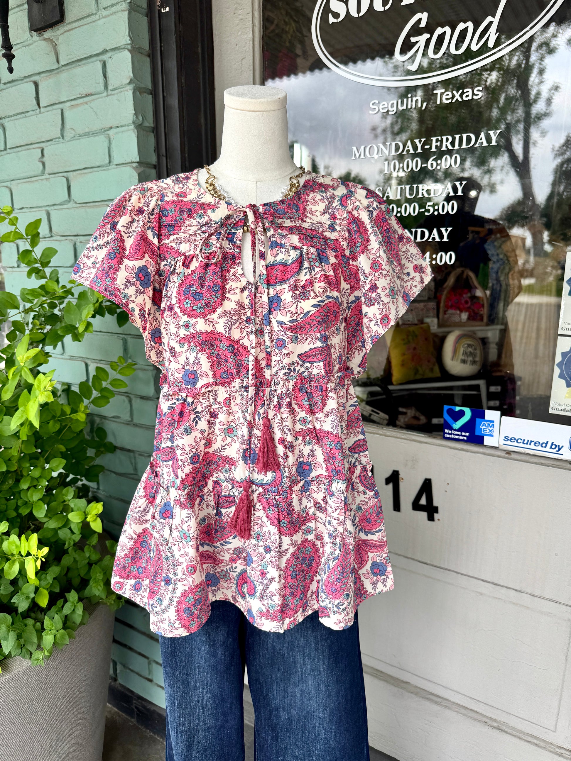 This Easel paisley print v neck top with tassel tie is the perfect addition to any wardrobe. The vibrant paisley print adds a touch of bohemian flair, while the playful tassel tie adds a fun and unique element. With a comfortable v neck design, this top is sure to become a favorite for any occasion.