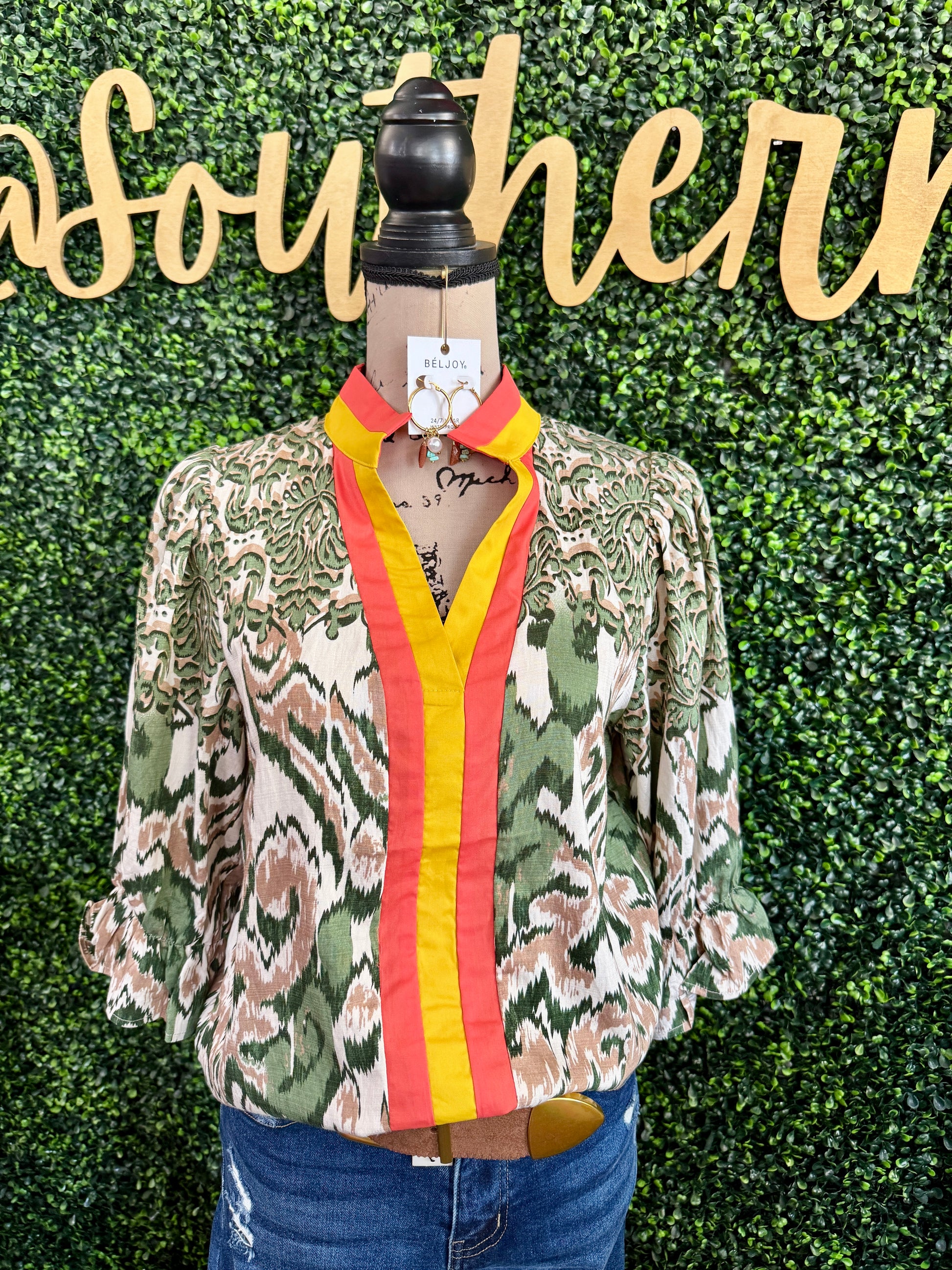 The Stella Top features a sleek abstract design highlighted by a bold striped placket and distinctive neck detail, adding a modern edge to your wardrobe. Crafted for both style and comfort, this top elevates everyday looks with subtle sophistication, making it perfect for work or weekend wear.