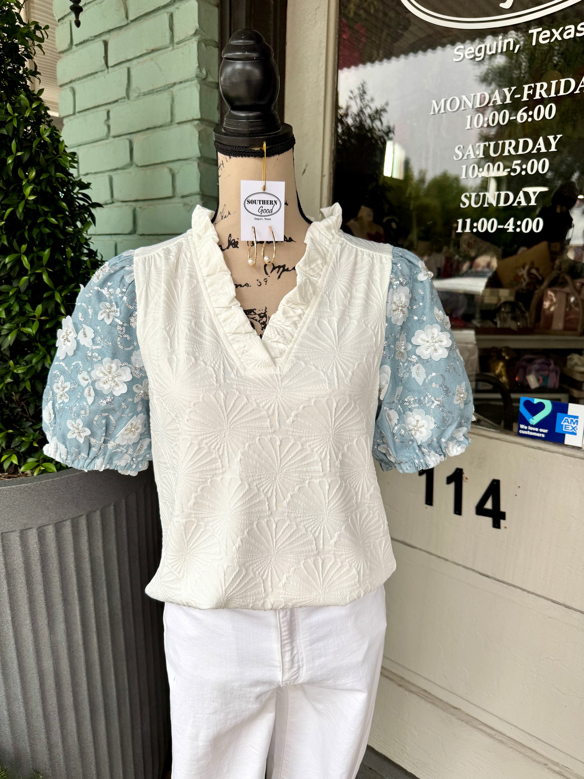 The Vara Top from Voy features delicate floral details on its charming puff sleeves, adding a touch of elegance to your look. Perfect for elevating everyday outfits, this top combines feminine style with comfortable wearability, making it a versatile addition to your wardrobe.