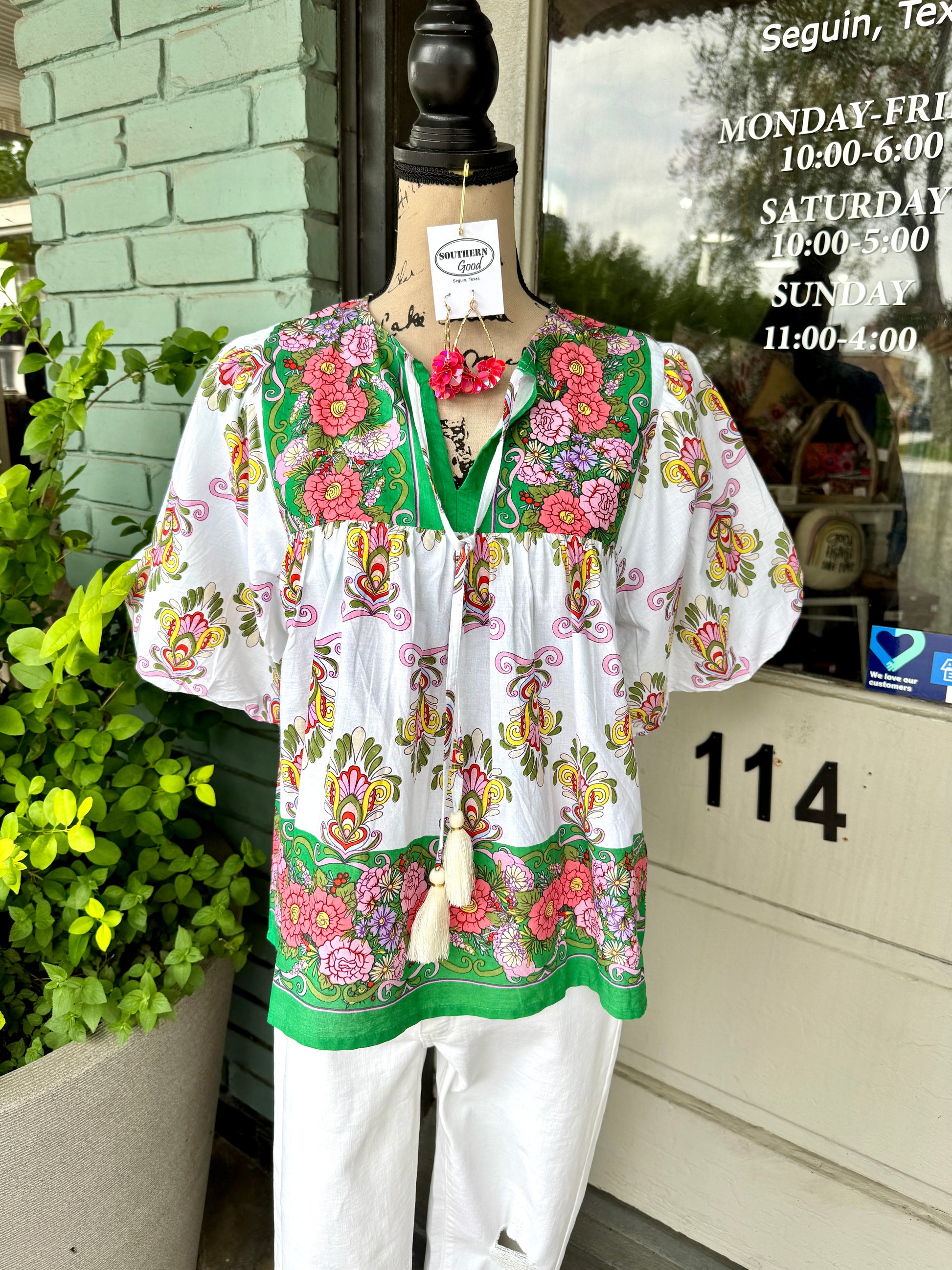 Introducing the Willis Top by THML, featuring a trendy puff sleeve design and a charming floral tassel tie. Made with 100% cotton for maximum comfort and style. Elevate your wardrobe with this must-have piece!